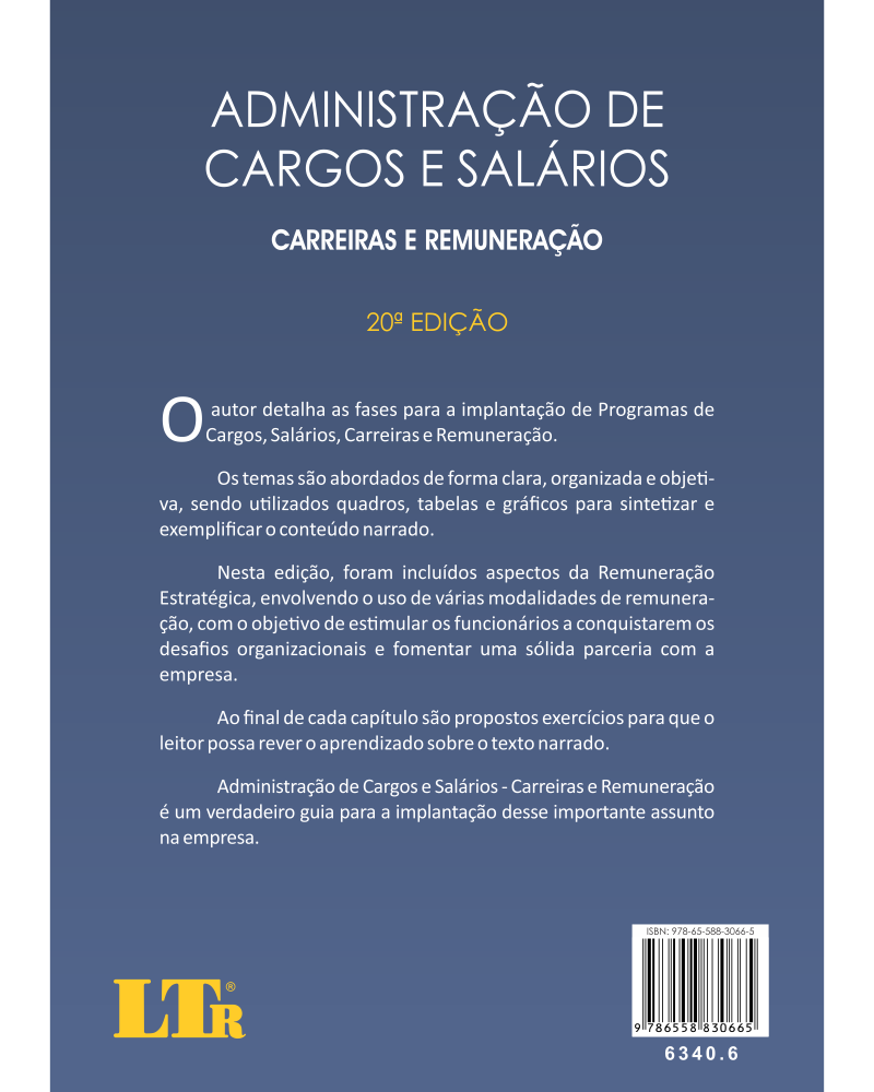 O autor detalha as fases para a implantação de Programas de Cargos, Salários, Carreiras e Remuneração. Os temas são abordados de forma clara, organizada e objetiva, sendo utilizados quadros, tabelas e gráficos para sintetizar e exemplificar o conteúdo narrado.
