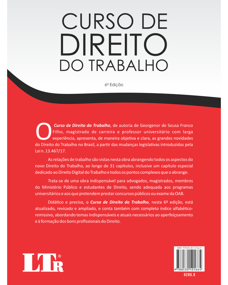 Didático e preciso, o Curso de Direito do Trabalho, nesta 6ª edição, está atualizado, revisado e ampliado, e conta também com completo índice alfabético-remissivo, abordando temas indispensáveis e atuais necessários ao aperfeiçoamento e à formação dos bons profissionais do Direito.