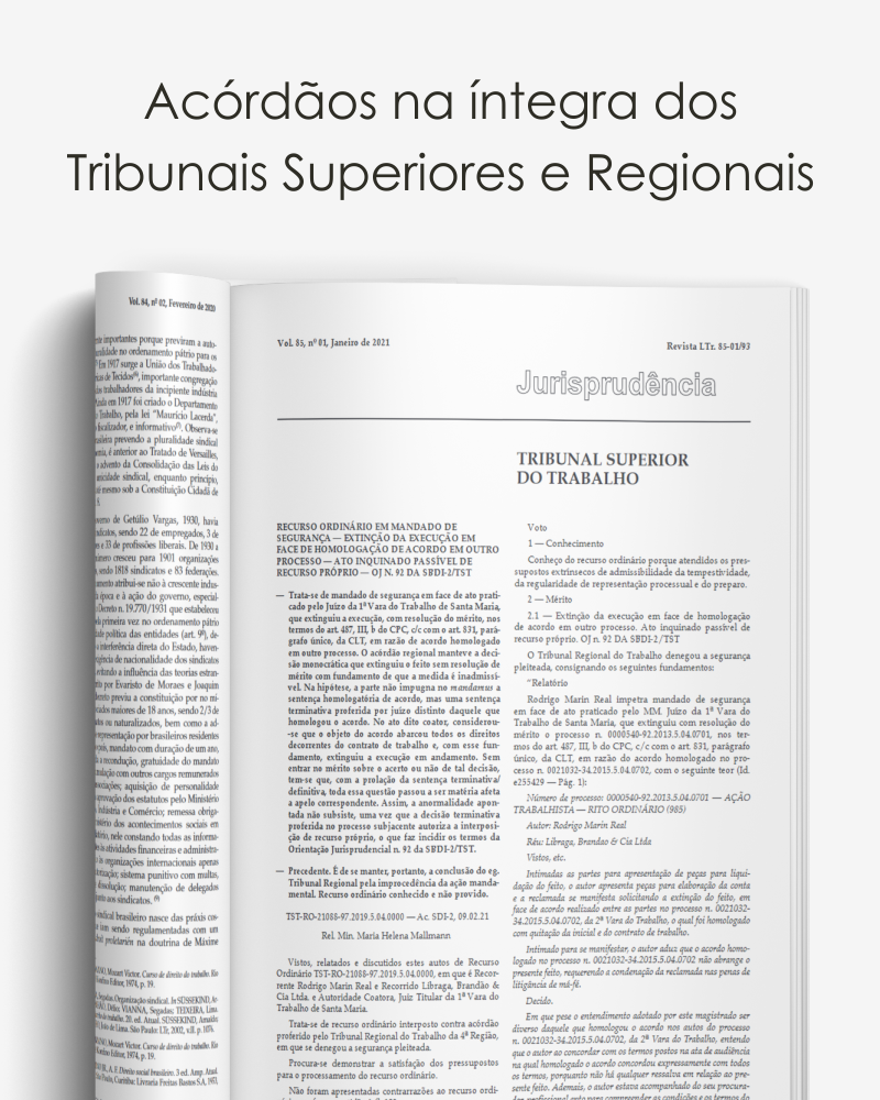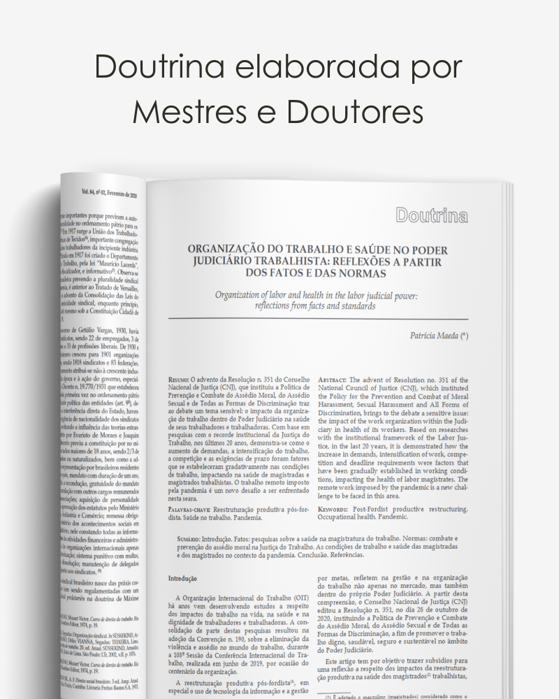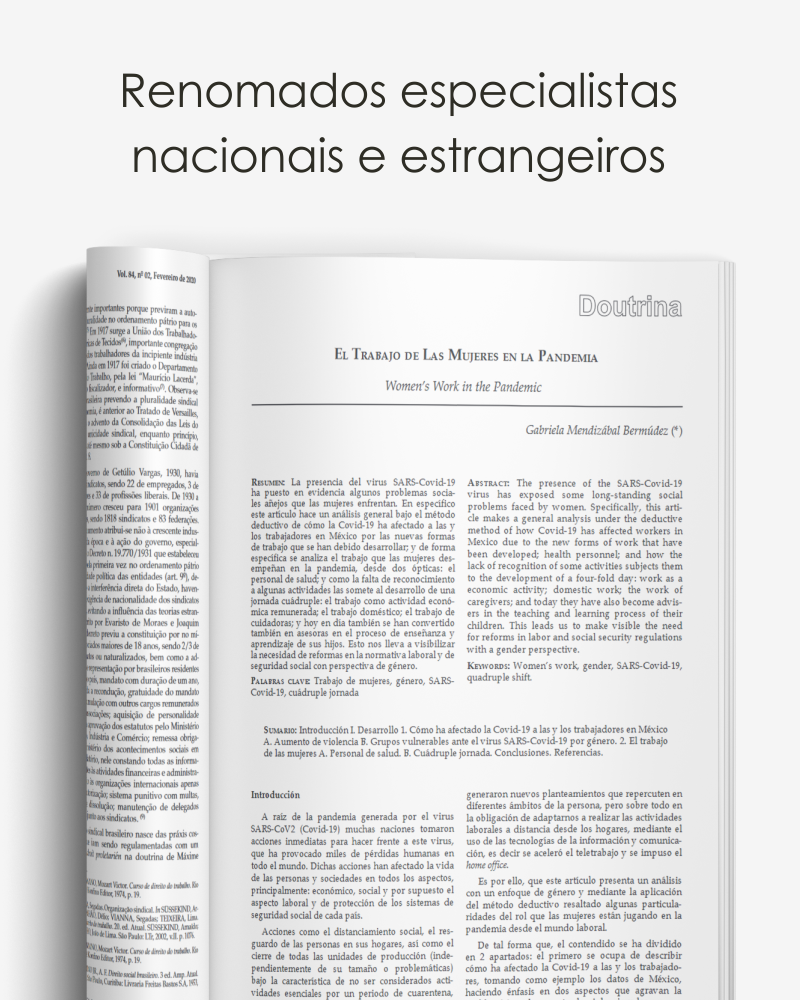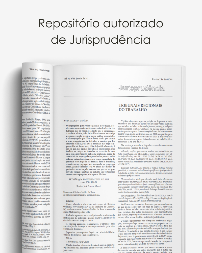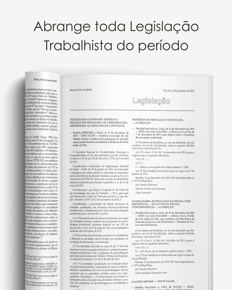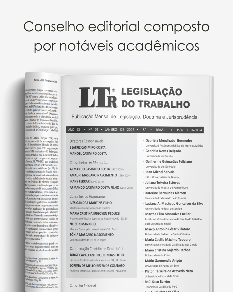 A Revista LTr é uma valiosa fonte de estudos e informações sobre doutrina, jurisprudência e legislação do Direito do Trabalho. Publicação mensal, editada há mais de 80 anos ininterruptamente. Abrange toda Legislação Trabalhista do período; Doutrina elaborada e assinada por eminentes especialistas em Direito do Trabalho; Jurisprudência Trabalhista, acórdãos na íntegra dos Tribunais Superiores e Regionais. Repositório autorizado para indicação de julgados no STF e no TST.